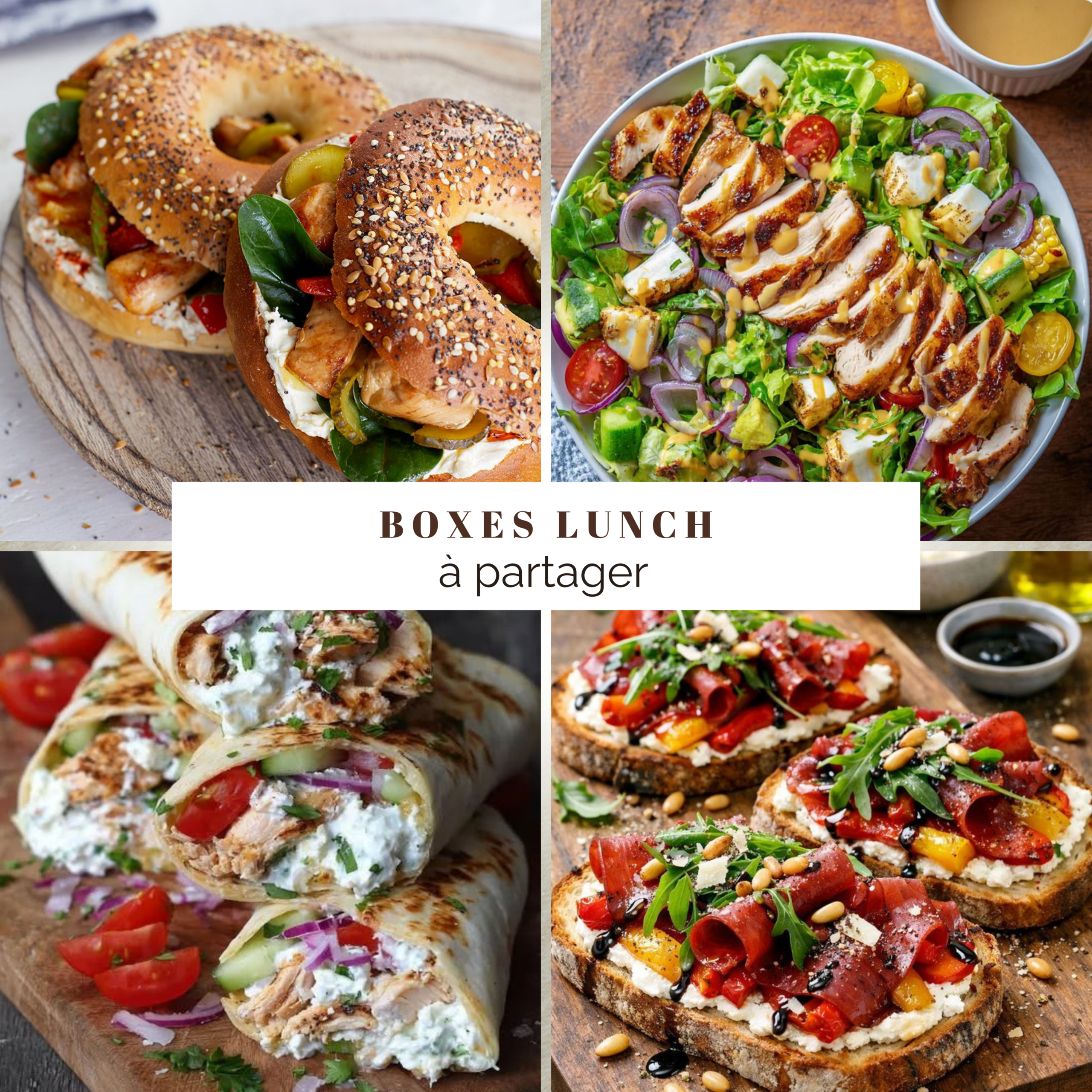 Bagels dorés et croustillants • Clubs sandwiches • Navettes gourmettes raffinées • Salades gourmandes et colorées • Tartines divines bien garnies • Wraps savoureux